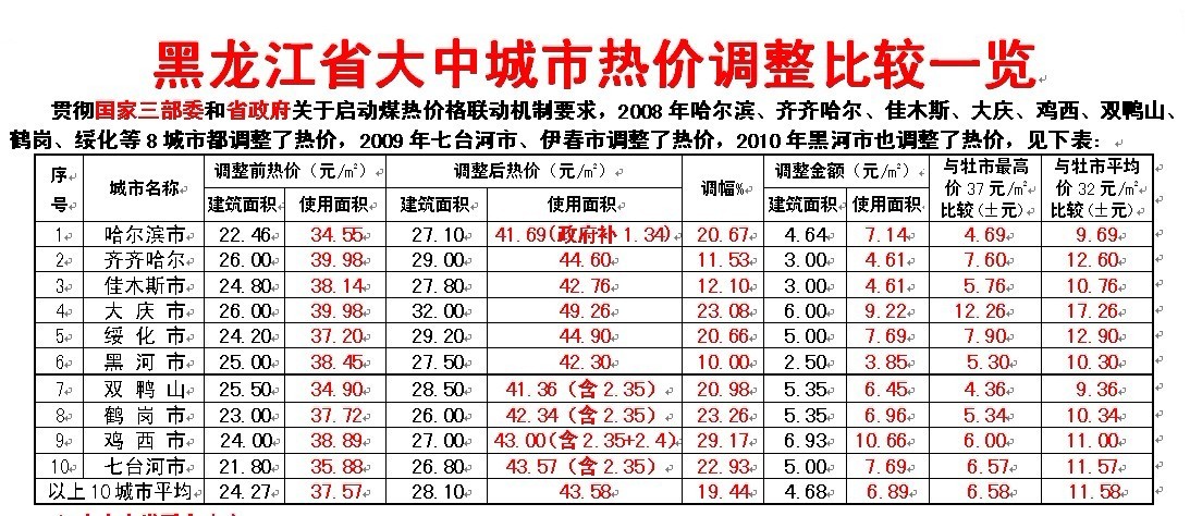 貫徹國家三部委和省政府關于啟動煤熱價格聯動機制要求,2008年哈爾濱、齊齊哈爾、佳木斯、大慶、雞西、雙鴨山、鶴崗、綏化等8城市都調整了熱價,2009年七臺河市、伊春市調整了熱價,2010年黑河市也調整了熱價,見下表: